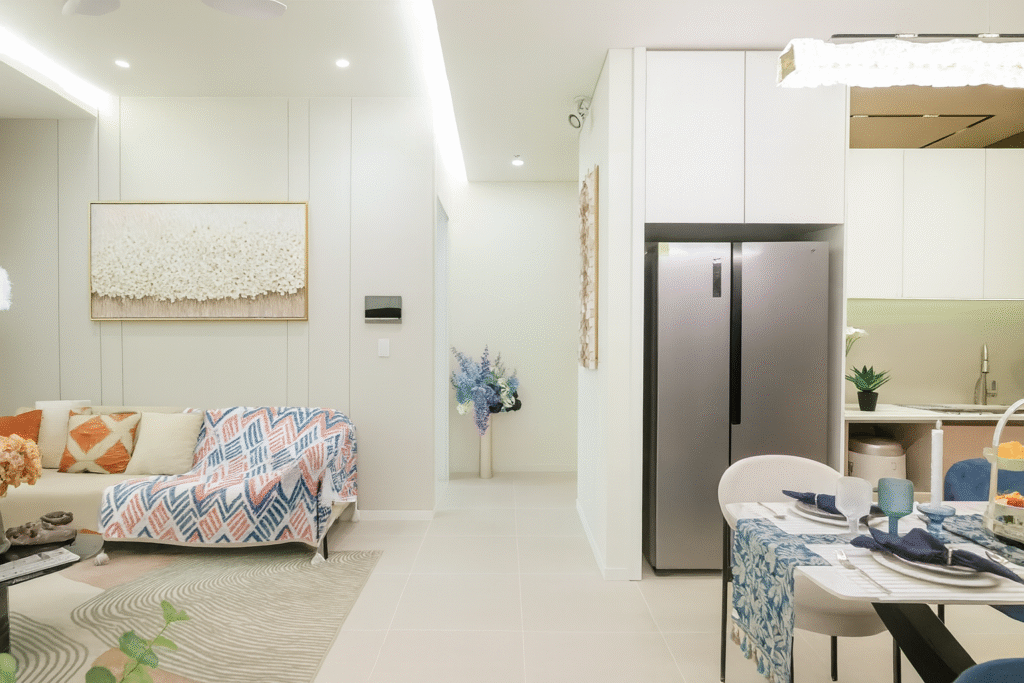 Khu vực phòng khách – bếp – bàn ăn được bố trí mở, giúp kết nối các thành viên trong gia đình và tận dụng tối đa ánh sáng từ hệ cửa kính lớn tràn viền. Phòng ngủ chính có ban công riêng, phòng thay đồ (dressing room) và phòng tắm riêng, mang đến sự riêng tư và tiện lợi tối đa. Phòng ngủ nhỏ được thiết kế linh hoạt, phù hợp cho trẻ nhỏ hoặc làm phòng làm việc, học tập tại nhà.