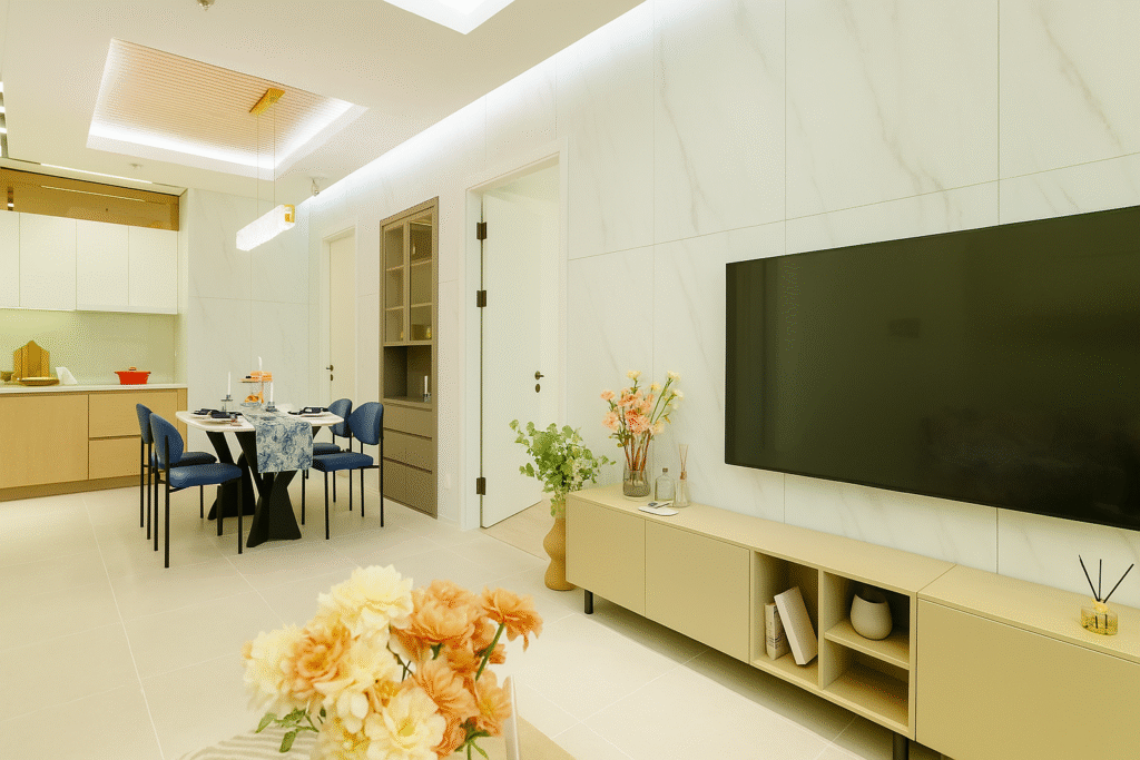 Không gian phòng khách nổi bật với sofa sáng màu, cửa kính lớn nhìn ra không gian xanh và ánh sáng tự nhiên tràn ngập. Bộ bàn trà nhỏ gọn cùng điểm nhấn từ hoa tươi và gối trang trí tạo nên cảm giác dễ chịu, gần gũi mà vẫn sang trọng.