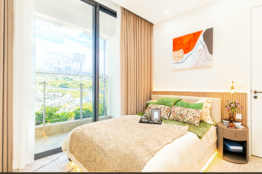 Phòng ngủ master gây ấn tượng với ban công riêng và tầm nhìn mở rộng ra khu biệt thự thấp tầng Starlake, mang lại cảm giác thư thái, dễ chịu. Nội thất được bố trí tinh gọn với giường lớn, tủ đầu giường, đèn thả trần và tranh trang trí trừu tượng – vừa hiện đại vừa nghệ thuật. Không gian sử dụng gam màu be – nâu ấm kết hợp ánh sáng tự nhiên, tạo nên nơi nghỉ ngơi lý tưởng sau một ngày dài.
