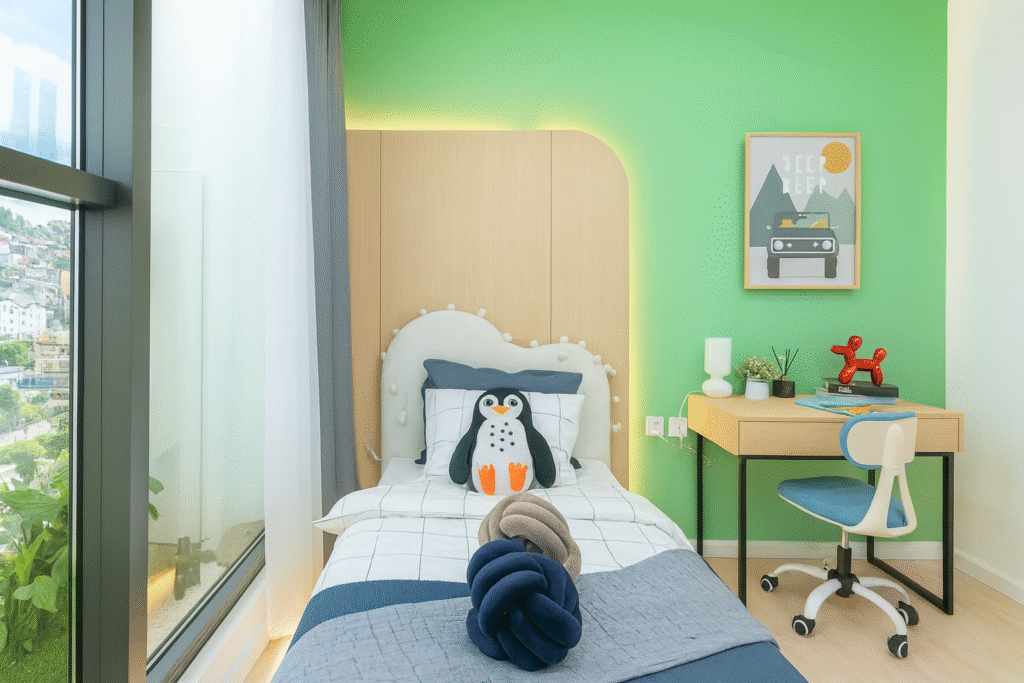 Phòng ngủ nhỏ được thiết kế dễ thương, đặc biệt phù hợp cho trẻ em. Gam màu xanh pastel kết hợp ánh sáng tự nhiên mang lại năng lượng tích cực, giúp bé có không gian học tập và nghỉ ngơi lý tưởng. Ngoài ra, căn phòng có thể linh hoạt chuyển đổi thành phòng làm việc hoặc phòng đọc sách – đáp ứng nhu cầu sống hiện đại của các gia đình trẻ.