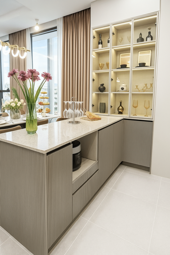Chất liệu cao cấp: Nội thất gỗ óc chó, đá tự nhiên và kính cường lực được sử dụng để tăng độ bền và vẻ đẹp tinh tế.